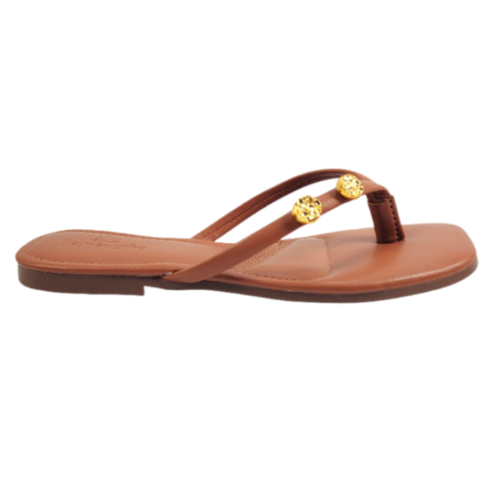 Sandália feminina rasteira de dedo estilo chinelo, em napa soft cor marrom, tiras com detalhes em tachas douradas, bico quadrado e palmilha confortavel na cor marrom, solado em borracha que não escorrega, sem fechamento traseiro sem fivela para prender ao tornozelo, proporcionando maior conforto ao caminhar, calçado ideal para pezinhos adulto de numeração 30 - 31 - 32 - 33.