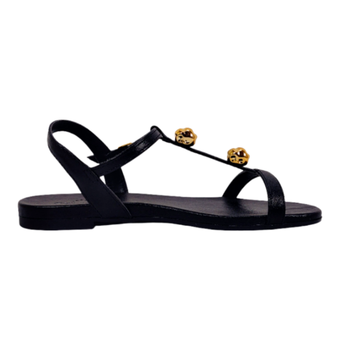 Sandália feminina rasteira, em napa soft cor preto, bico redondo, palmilha confortavel na cor preto, tiras largas, detalhe em tachas douradas, solado em borracha que não escorrega, sem fechamento traseiro com fivela para prender ao tornozelo, proporcionando maior conforto e confiança ao caminhar, calçado ideal para pezinhos feminino adulto de numeração 30 - 31 - 32 - 33.