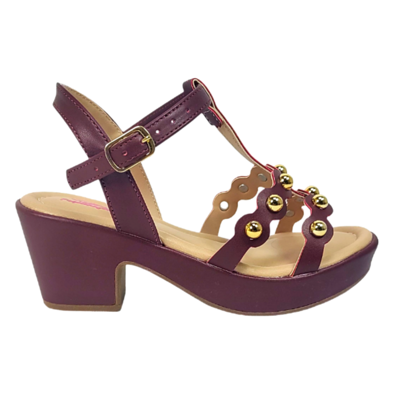 Disponível nos tamanhos 30, 31, 32 e 33. A sandália marsala em napa bali com tachas douradas, salto médio grosso meia pata 6cm e solado caramelo integrado é a sandália com a combinação de tons quentes mais sofisticada do catálogo, com estabilidade real para uso prolongado e fôrma adulta para pés pequenos. Estoque limitado em cada numeração.
