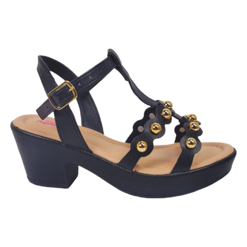 Disponível nos tamanhos 30, 31, 32 e 33. A sandália preta em napa bali com tachas douradas, salto médio grosso meia pata 6cm e solado TR integrado é a sandália com identidade visual forte e conforto real para uso prolongado, com fôrma adulta para pés pequenos. Estoque limitado em cada numeração.