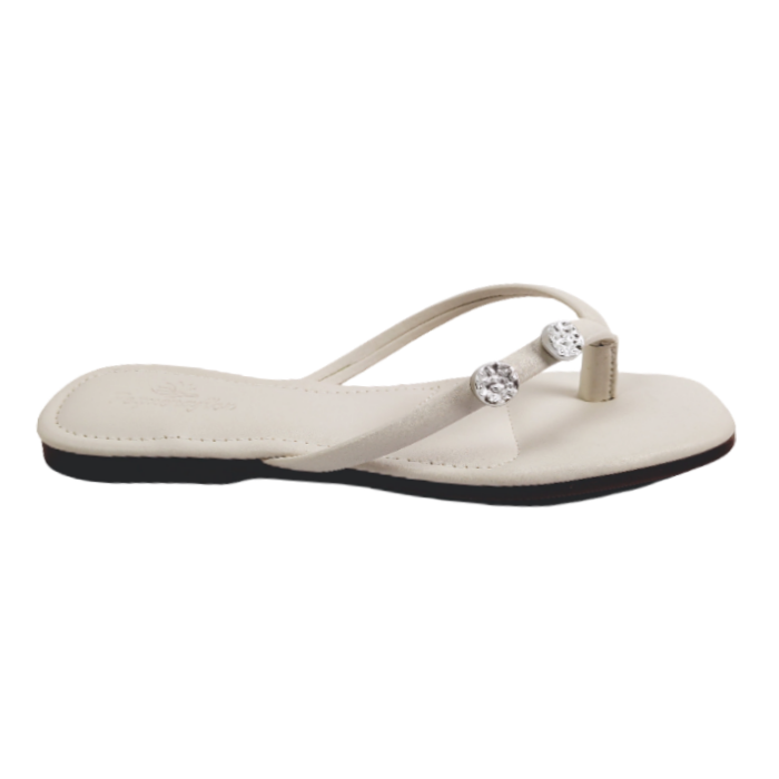 Sandália feminina rasteira de dedo estilo chinelo, em napa soft cor offwhite, tiras com detalhes em tachas prata, bico quadrado e palmilha confortavel na cor offwhite, solado em borracha que não escorrega, sem fechamento traseiro sem fivela para prender ao tornozelo, proporcionando maior conforto ao caminhar, calçado ideal para pezinhos adulto de numeração 30 - 31 - 32 - 33.