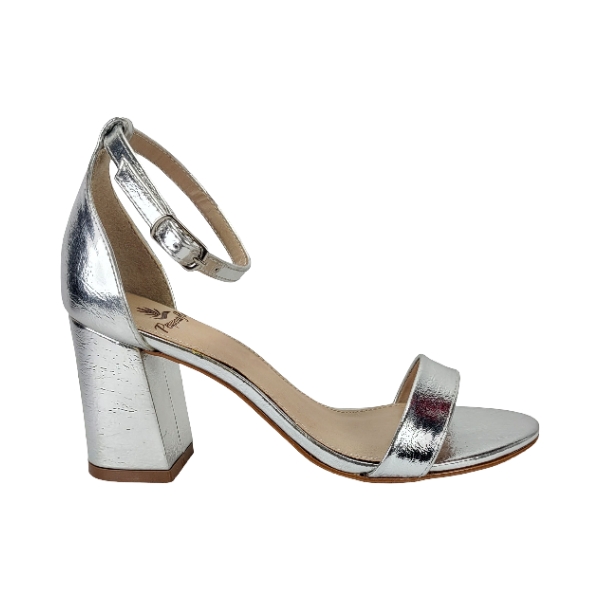 SANDALIA SALTO GROSSO MÉDIO EM NAPA SOFT METALIZADO COR PRATA - TIRA ÚNICA.