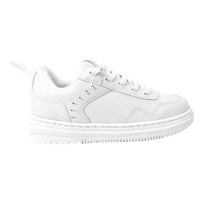 Entre os tênis brancos do catálogo, este modelo se posiciona pelo detalhe que os outros não têm: o design lateral exclusivo que cria identidade visual própria dentro do padrão total white. O cabedal em napa resistente, o forro interno acolchoado, o solado antiderrapante e o cadarço, todos na cor branca, atendem ao padrão visual completo exigido por uniformes profissionais em saúde, estética e alimentação. O design lateral acrescenta personalidade ao calçado sem comprometer nenhum desses requisitos. Para quem calça do 30 ao 33 adulto e busca exatamente essa combinação, a oferta no mercado convencional é quase inexistente.